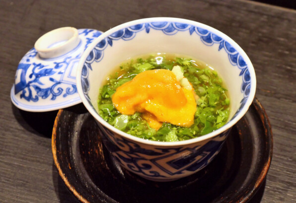 ●温かい先付。海老芋と卵白を合わせた蒸しもの。なめらかで、ほんわかと、海老芋のピュレの柔らかいのを食べている感じ。