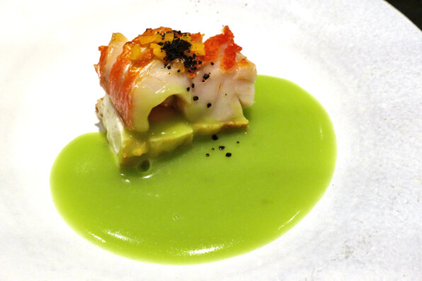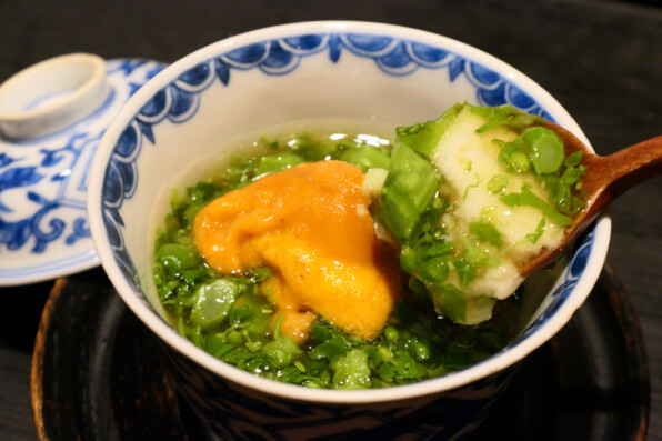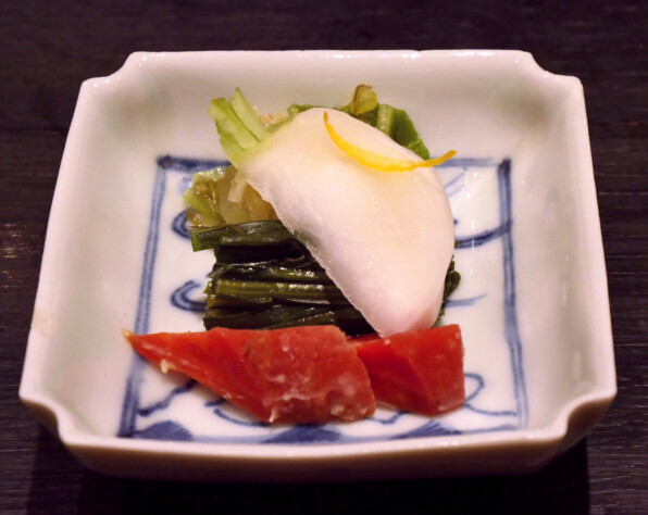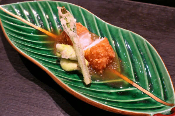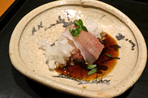 葛でとろみをつけた土佐醤油に、油漬けにしておいた木の芽を(ピストゥソースを作る時のように)ミキサーにかけたものを少量混ぜ込んでいる。大根鬼おろし、木の芽。