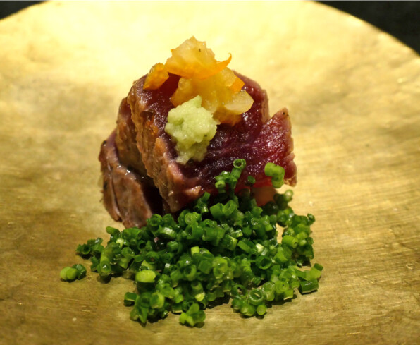 ●まぐろ。煎り番茶でスモークしたものを、醤油昆布麹で和えたもの。