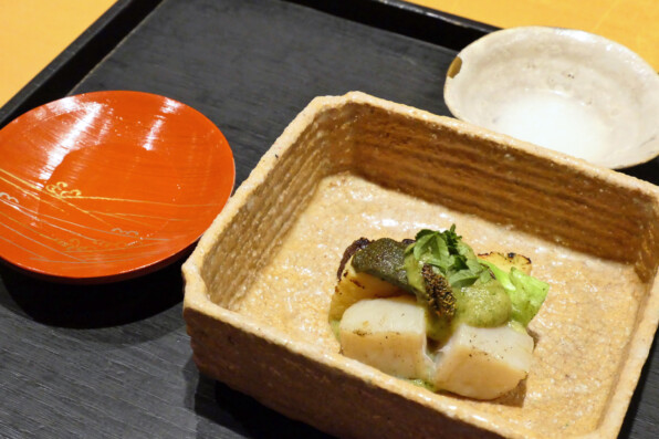 ●ひと皿目は平貝の炙り、筍、椎茸に、温かい木の芽味噌。