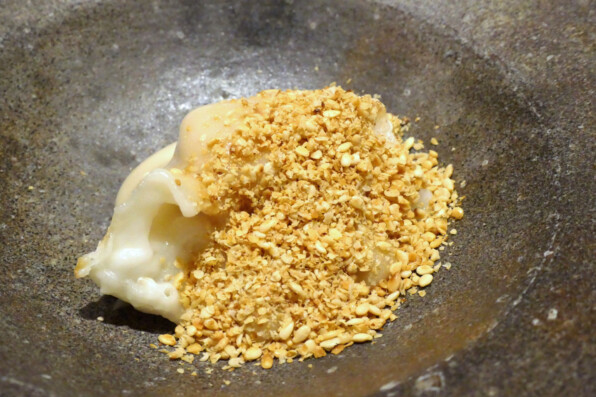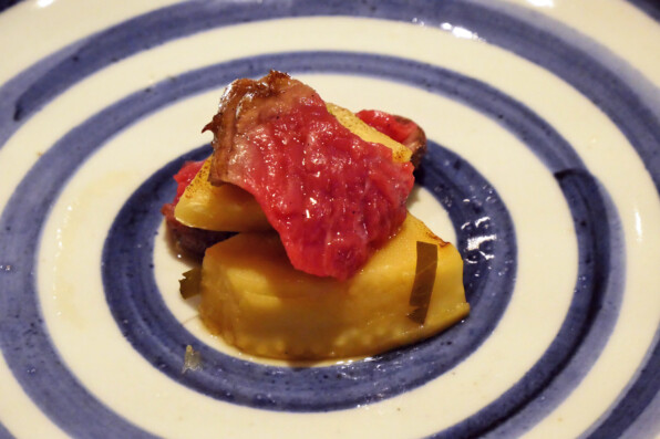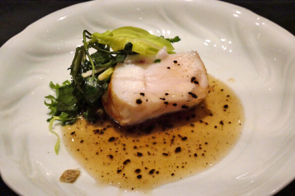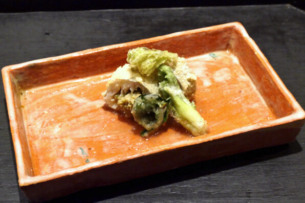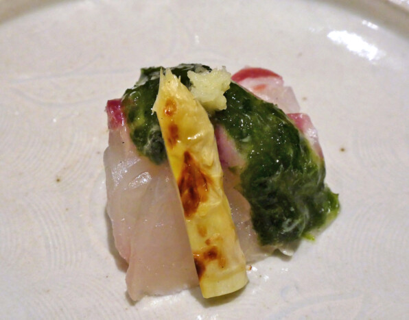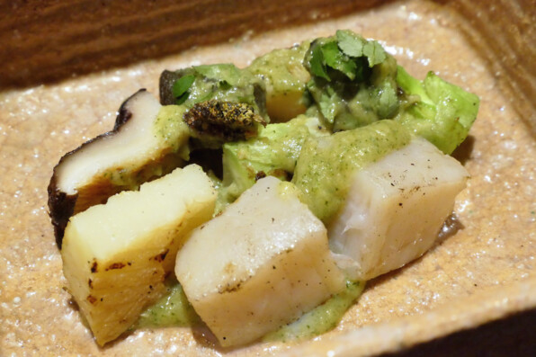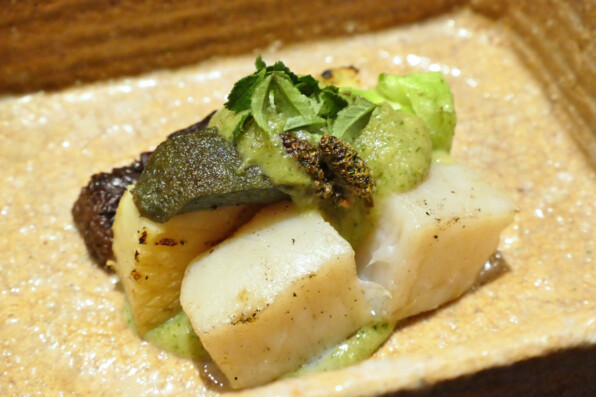 ●くえ。焼き野菜(チコリ、黄うるい、クレソン、わさび菜)には文旦オイルをまとわせていて粋。大徳寺納豆のあん。