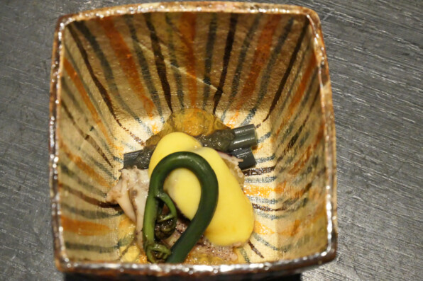●耳烏賊、わらび。土佐酢ジュレと、酒粕を混ぜ込んだ黄身酢。