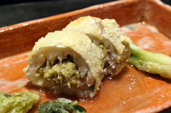 ●太刀魚の道明寺粉揚げ。中にふきのとう。たらの芽、こごみ。