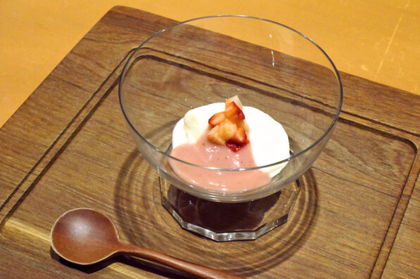 ●デセールは豆乳と甘麹のパンナコッタに、豆乳カスタードにいちごジャムを合わせたソース。上からさいの目にしたいちご。