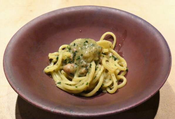 ●パスタは、雲丹、春キャベツ、新生姜。木の芽。