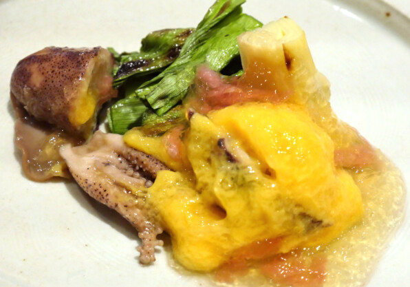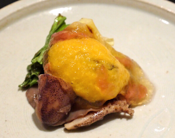子持ち白いか、炭焼きした甘草、筍。黄身酢、桜ジュレ酢。