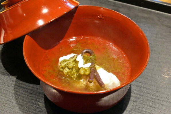 ●はたのお椀。わらび、新もずく、花柚子、しのび生姜。