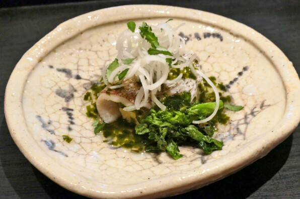 オリーヴオイルをつけて炭火で炙ってありました。上に新玉ねぎのスライス、ペリーナ、青海苔。葛でとろみをつけたポン酢、文旦オイル入りで粋な香味。