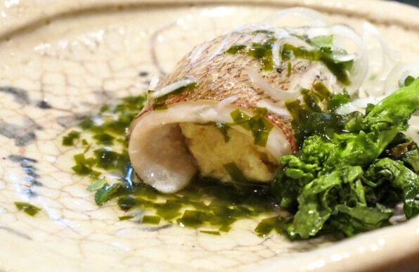 おからを巻き込んだ小鯛。このおからが、(夜に供される)グラスフェッドの牛肉から出た脂と合わせてあり、中に食感の素敵なアクセントとして筍と独活(うど)。菜種の炭焼き。よりうど、木の芽。わかめあん。