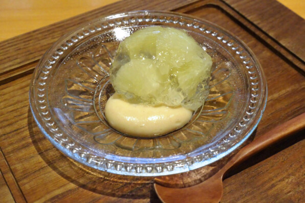 白ワインのジュレのつるりとした食感に柑橘の酸味が心地よく、そして、先月冗談で言った「カスタードクリームに胡麻」が実現されていて、しかし冗談のわりに、これはこれでおいしかったのでした\(^o^)/☆☆☆