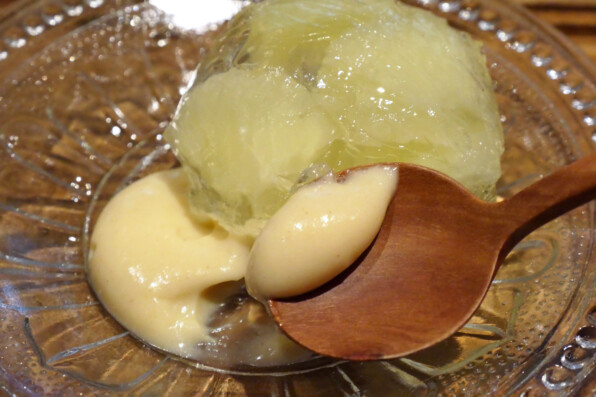 ●文旦の白ワインゼリー茶巾、胡麻カスタード。