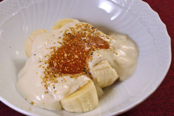 Sちゃんのおすすめに従って豆乳ヨーグルトを買ってきて、バナナ、豆乳ヨーグルト、マヌカ蜂蜜、そして上からノーブルな七味をかけてみましたよっと![]()