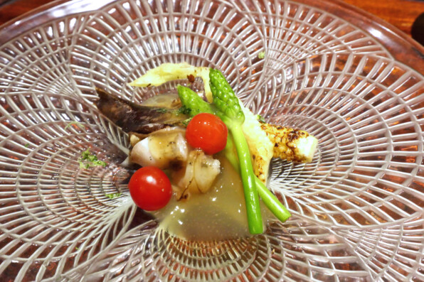ひげの部分を天ぷらにしたヤングコーン、アスパラソヴァージュ、マイクロトマト、土佐酢あん、振り柚子。