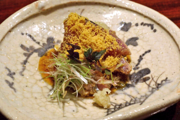 ひと皿の中で、香りがいく重にも重なって感じられて、もちろんかつおは旨味たっぷりで、長芋やら、ねぎや茗荷のしゃりしゃりした食感がリズムになって、生姜が粋に効いて・・・口の中が楽しくて楽しくて仕方がなかったです。