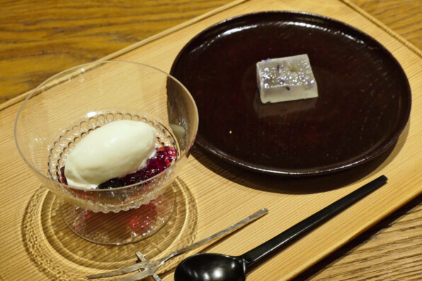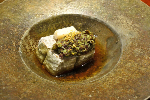 ●「宮ざわ」さんの名物である焼き胡麻豆腐の進化形、今回はわらび豆腐です。