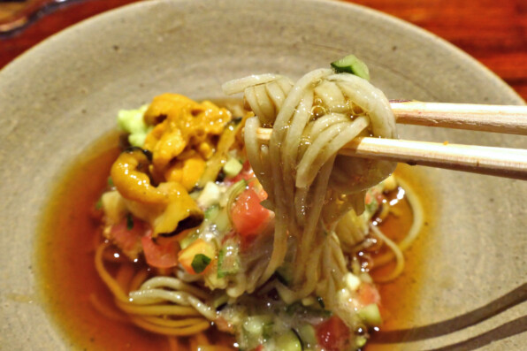 今回は夏野菜のまぜ蕎麦で、お蕎麦の上に、
