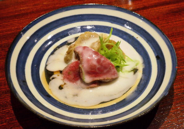 ●グラスフェッド牛肉に、炊いた白茄子、針状のきぬさや。生姜、白胡麻ソース。