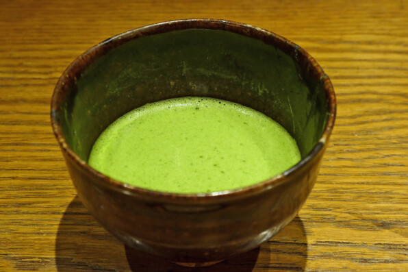 本体にわらび練り込み、上に叩いたわらび。煮ほたて。わらびの上から自家製七味。いとも優美な香味の七味です。