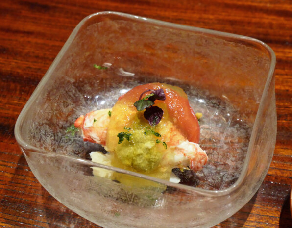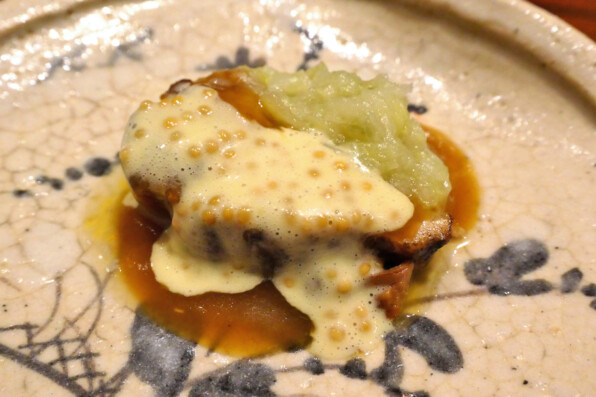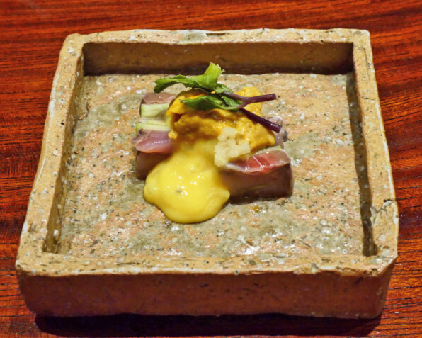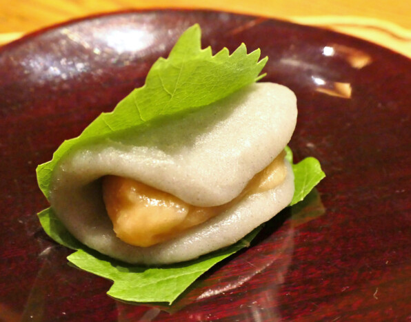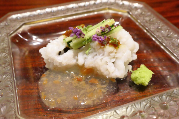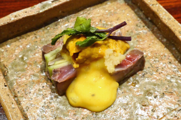 ●赤あじ、白瓜、生姜の博多押し。赤雲丹。防風、生姜。ゴールデンキウイを混ぜ込んだ黄身酢。粋な酸味。