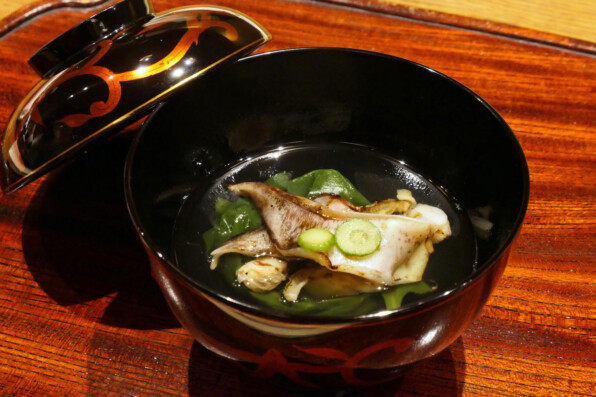 ●とり貝のお椀。炙ったとり貝、おかわかめ、実柚子。