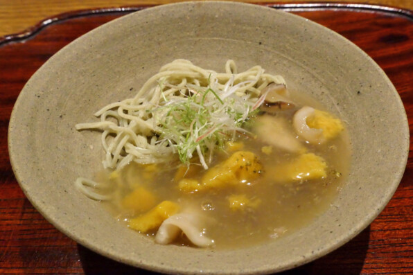 いちご煮風に貝と紫雲丹がたっぷりのったお蕎麦。