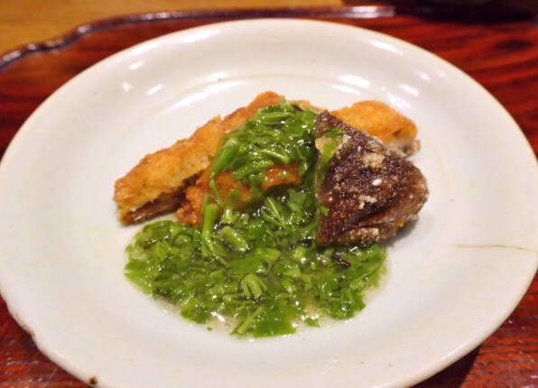 ●太刀魚 赤紫蘇 はさみ揚げ。砕いたお麩を使った薄い衣は、ごく軽やかな口当たり。
