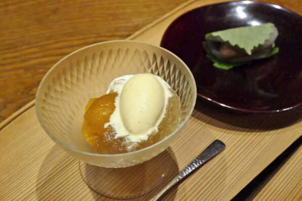 ●枇杷のコンポート、薔薇の紅茶ジュレ、ヴァニラのアイスクリーム。
