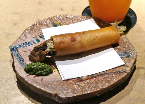 ●モルタデッラで巻いた琵琶湖の稚鮎、 春巻き。