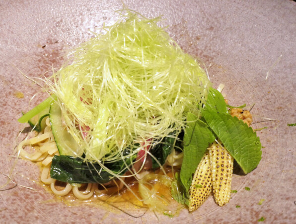 ●きれいで、しっとり美味なお料理を楽しんだ後は、まさかの、賀茂茄子の皮をかき揚げにしたものが供されました。「吉兆」さん時代、皮も無駄にせず、まかない用に、こんな風に天ぷらにしていたと。