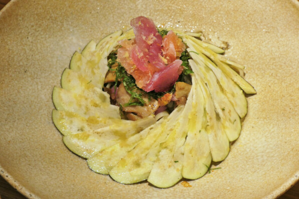 茄子のバルサミコマリネ、ローストしたトマト、蕪、ズッキーニ。ルッコラ、トレヴィス、赤水菜、その他ベビーリーフいろいろ。