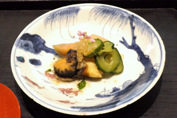 さざえ、水茄子トマト漬け、水玉きゅうり、花穂紫蘇。旨みをきかせたジュレ酢のソルベ。