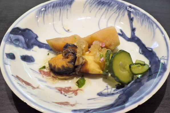 2023年7月、ちょうど1年前に「ごだん」さんに伺った時に、このお皿で先付をいただいています。