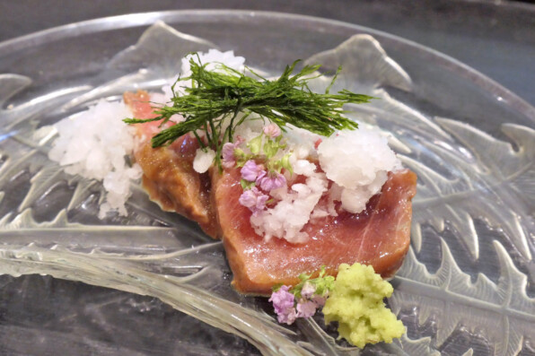 もち米の藁でいぶしたまぐろは、づけにされています。八代の青海苔は目覚ましく香りがよかったです。