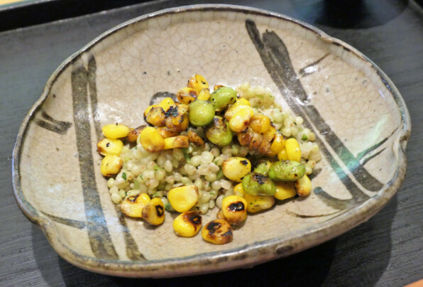 あさりだしで炊いて、炭火で香ばしく醤油風味をつけながら焼いたとうもろこしや枝豆と合わせてあります。