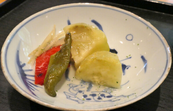 賀茂茄子と万願寺とうがらし2色、新生姜。