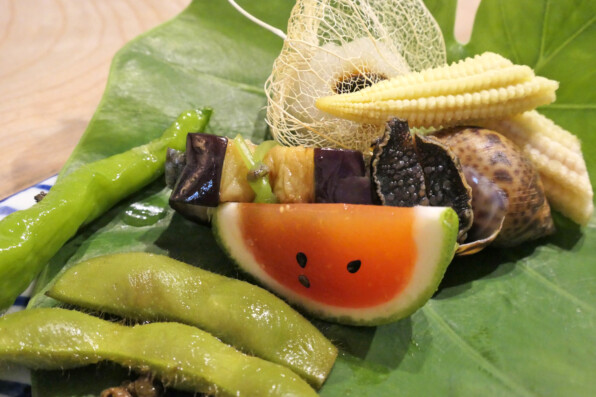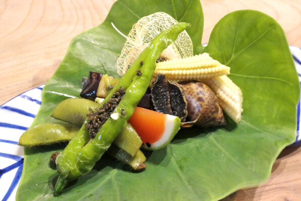 ばい貝、伏見唐辛子、にしん茄子、枝豆有馬煮、ヤングコーン味噌漬け。
