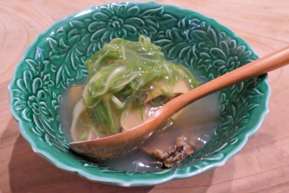 ●炊き合わせで鮑。下に賀茂茄子。九条ねぎ。