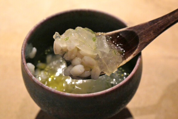 小さなカップで、押し麦と冬瓜のスープ。いきなりおいしーい☆☆☆