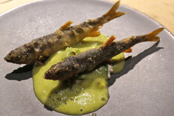 ●琵琶湖の小鮎は、焼ききゅうりとピータン豆腐ソースで。