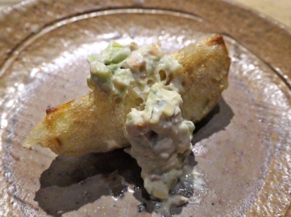 サクサクサクの食感のフリット、中の水茄子は熱々ながらしっとりしていて、うっまーい。
