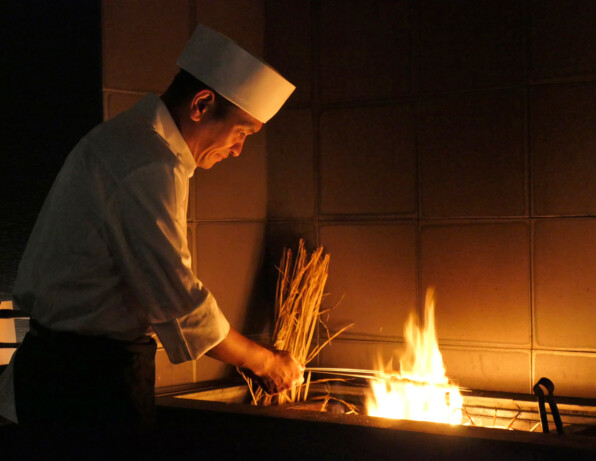 ●初めの見せ場、闇にドラマティックに浮かび上る藁焼きは、今回はまぐろではなく、