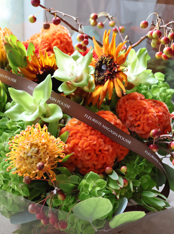 黄色、オレンジとグリーンの、目にも鮮やかな秋アレンジメントです。