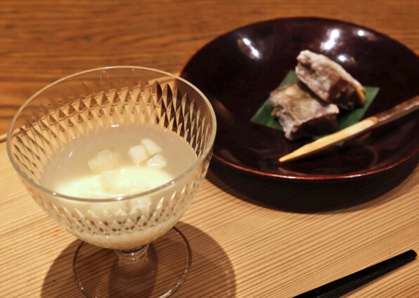 富山の「羽根屋」を食前酒にひと口いただきお料理スタートです。