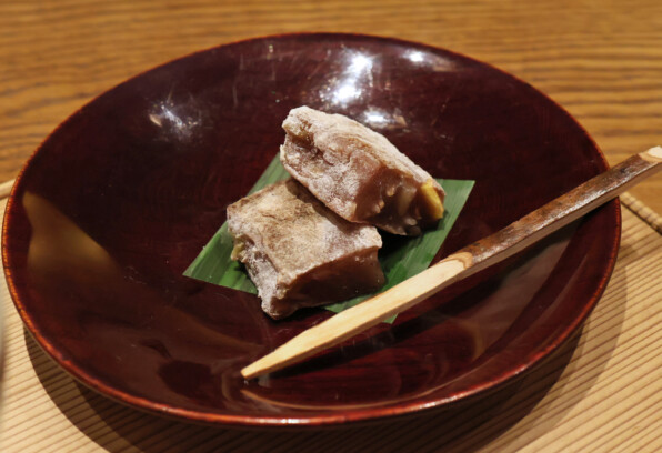 炭焼きにした鮎を、骨まで柔らかく蒸して、お酢入りのだしで炊いたもの。