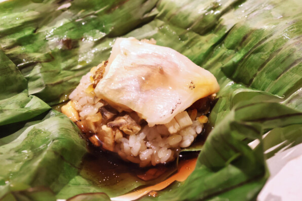 もち米ときのこと甘鯛を、バナナの葉に包んで蒸したもの。