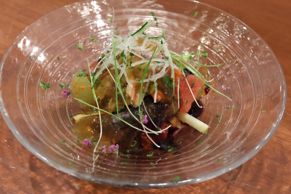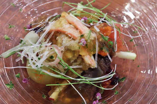 こっぺ蟹の身の下に、トマト、茄子のバルサミコマリネ、赤万願寺とうがらし、シャインマスカット、ピンクグレープフルーツ、りんご、大葉、芽ねぎ、花穂紫蘇。