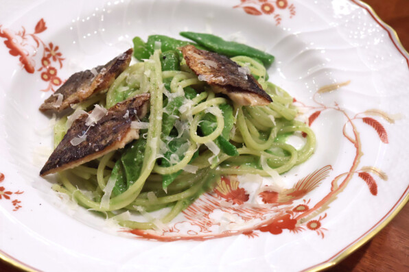 秋刀魚と万願寺とモロッコいんげんのスパゲッティ、バジルソース。