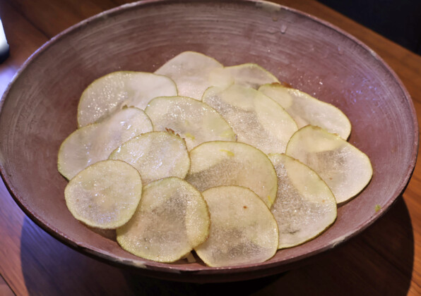 薄く輪切りにスライスされた洋梨が一面にびっしりと。それをめくると鶏肉コンフィや水キムチやモッツァレッラが現われます。