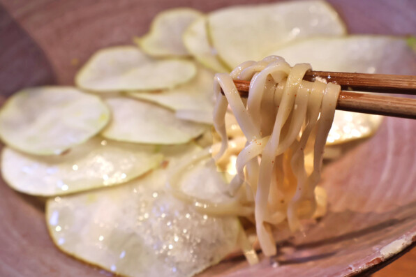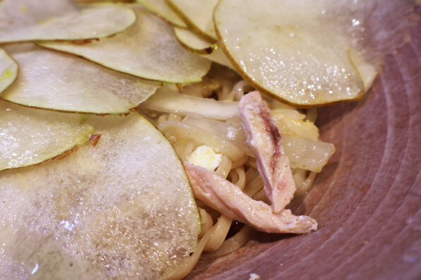 洋梨の甘みとまぜ麺のスープの塩気がすてきなコントラストとなり、