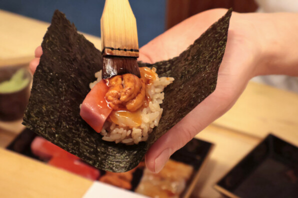 ●お造りに続いて、うに、まぐろ、いかの、うまい巻き。